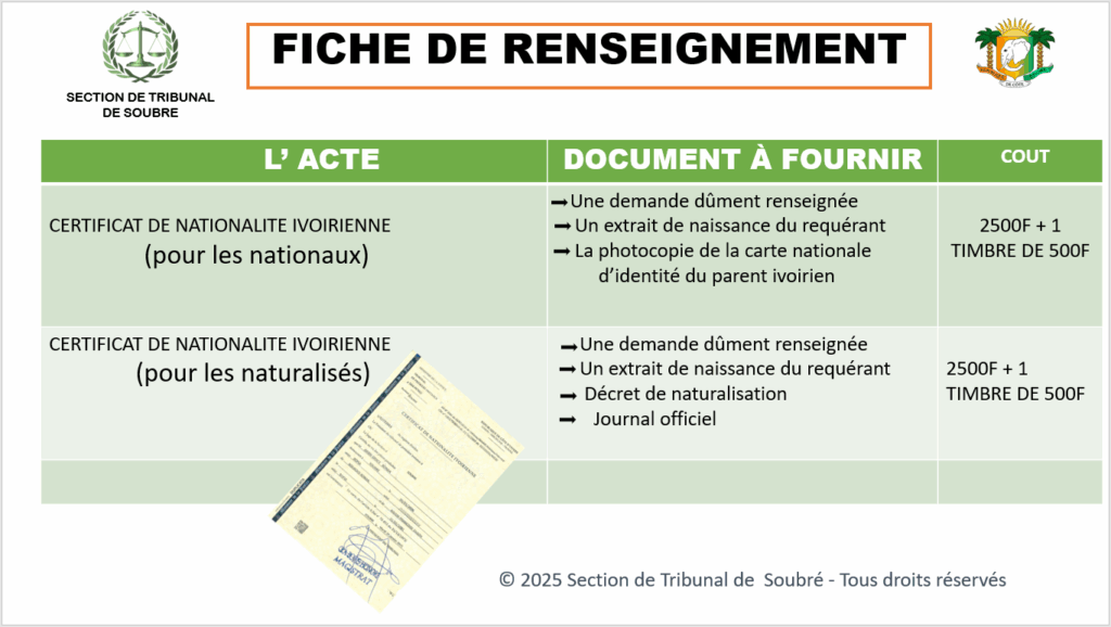 Certificat de Nationalité Ivoirienne: 2500F CFA + 1 Timbre de 500F CFA, Durée de Traitement 06 jours.